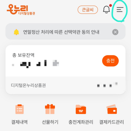 1) 디지털온누리상품권 앱 실행 → 우측 상단 ‘≡’ 버튼 누르기