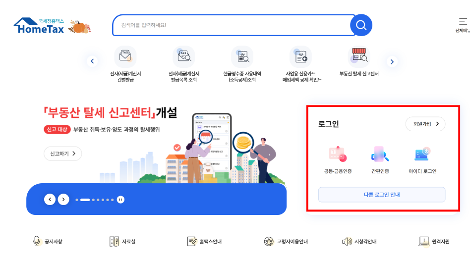 홈택스(www.hometax.go.kr)에 접속합니다. 원하는 방법으로 로그인 합니다.