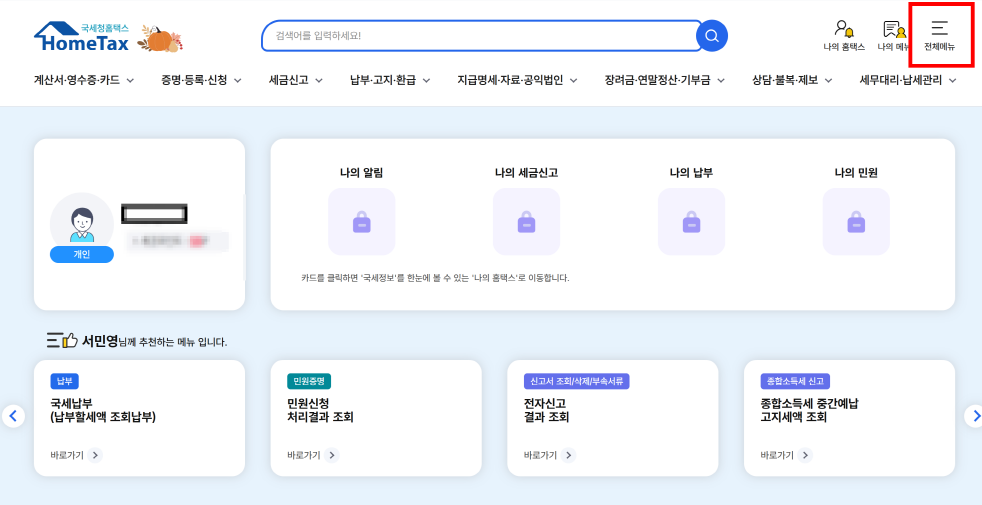 인증이 끝나면 전체 메뉴를 클릭합니다.