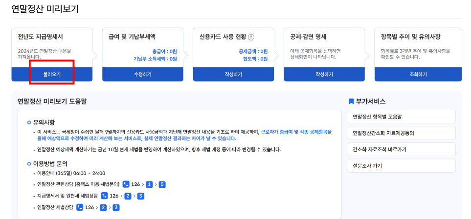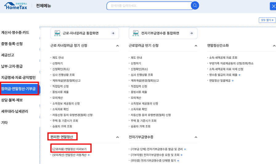 장려금·연말정산·기부금 → 편리한 연말정산 → 연말정산 미리보기
