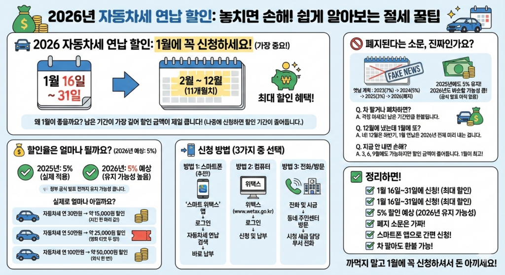자동차세 연납하면 돈을 아낄 수 있다는 건 알고 계시죠? 그런데 언제 내야 하는지, 얼마나 할인받는지, 폐지된다는 소문은 진짜인지 헷갈리시는 분들 많으실 겁니다. 2026년 기준으로 자동차세 연납 할인 관련된 정보를 쉽게 설명드릴게요.