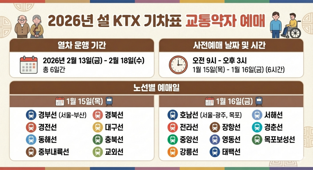 2026년 설연휴를 맞아 코레일에서는 인터넷 이용이 어려운 교통약자를 대상으로 일반 예매보다 먼저 승차권을 구매할 수 있는 사전예매를 실시합니다. 일반인보다 4일 먼저 예매할 수 있어 원하는 시간대 선택이 훨씬 수월합니다.